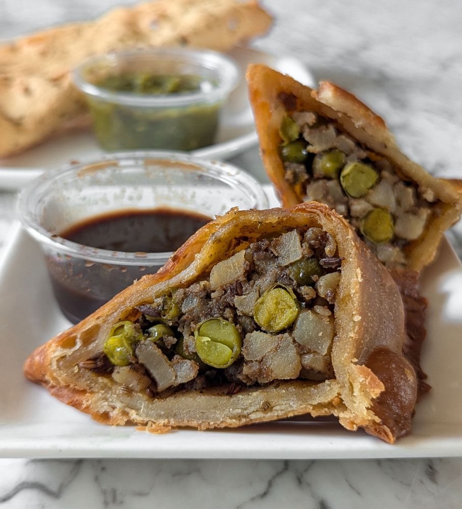 crispy fried turnover , filled with mildy-spiced potatoes and green peas.